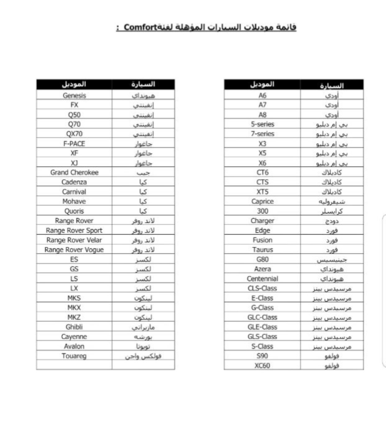 قائمة السيارات المقبولة دليل الكابتن لتسجيل اوبر و كريم