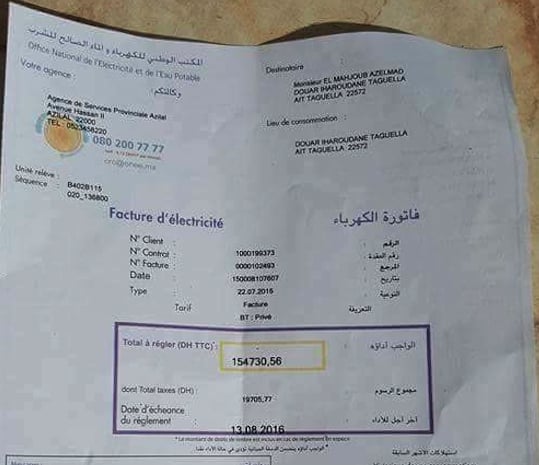 أزيـــــلال 24 الحماق هذا Onep يطالب أسرة بسيطة بسداد 15 مليون سنتيم عن شهر واحد من الاستهلاك