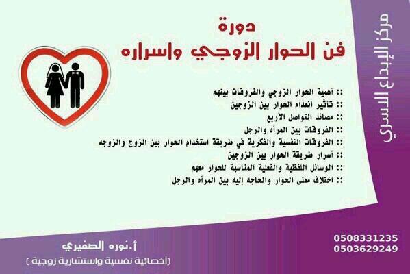 دورات مطمئنة Ar Twitter تقام في مطمئنة الرياض يوم السبت دورة فن الحوار بين الزوجين للنساء تعرف الدورة مراحل الحوار الصحيح بين الزوجين وتأثيره في حل المشكلات للتسجيل 0112222189 أو واتس اب