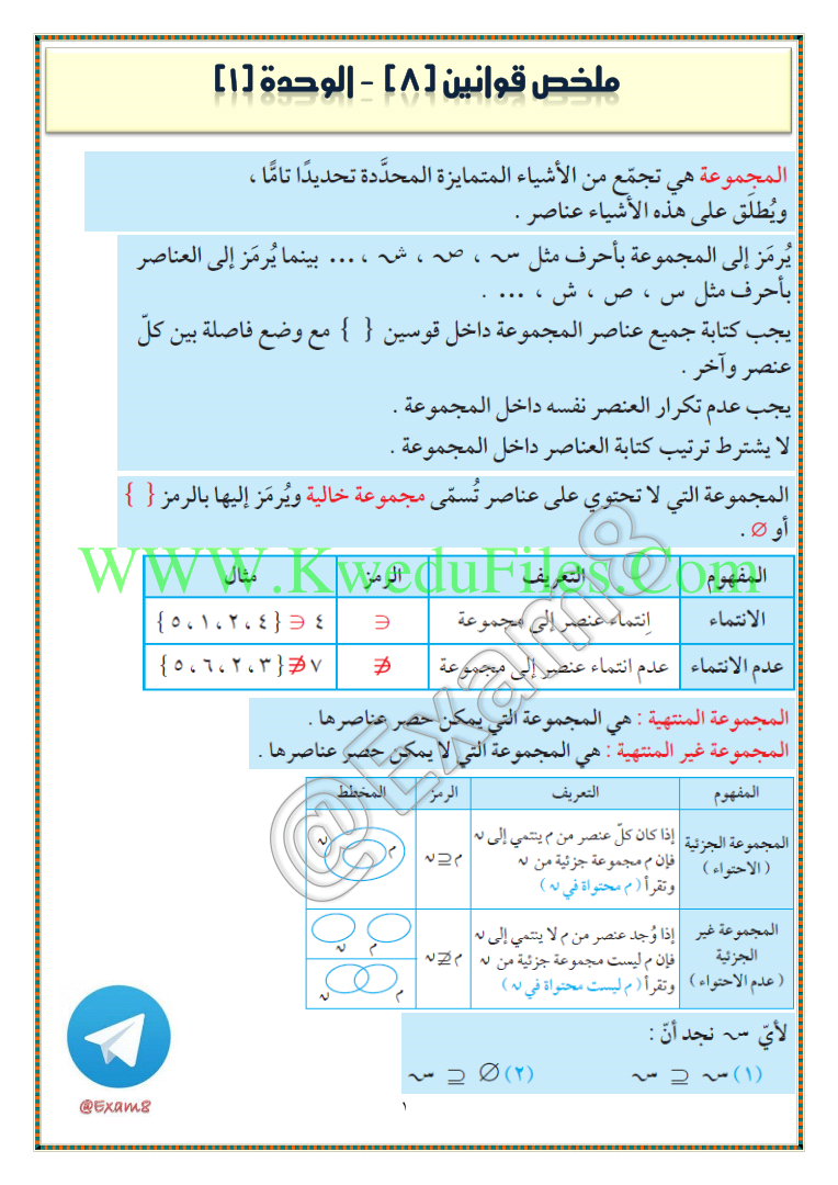 ملخص قوانين الوحدة الاولى في مادة الرياضيات لعام 2018 الصف الثامن رياضيات الفصل الأول المناهج الكويتية