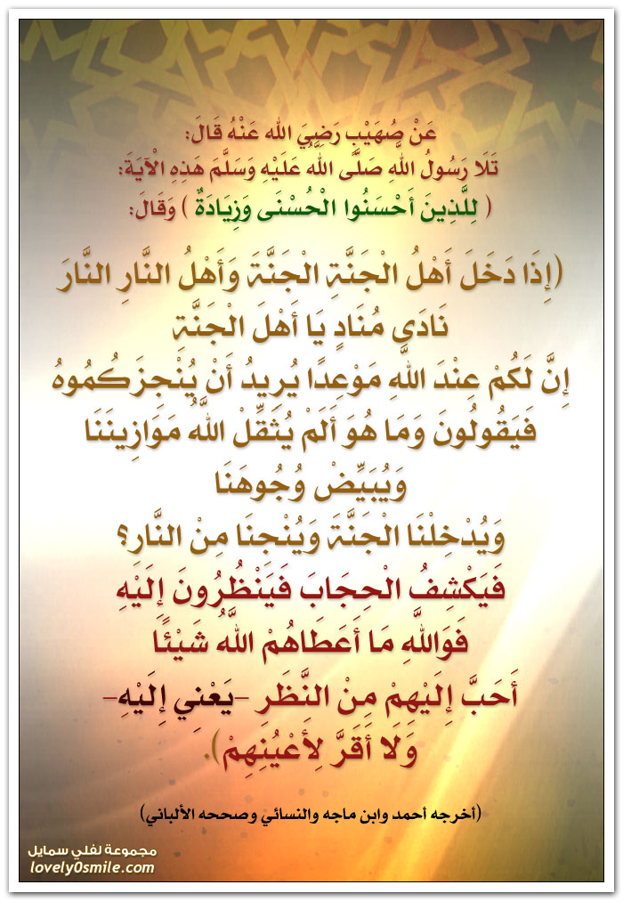 تلا رسول الله صلى الله عليه وسلم هذه الآية للذين أحسنوا الحسنى وزيادة وقال إذا دخل أهل الجنة لفلي سمايل