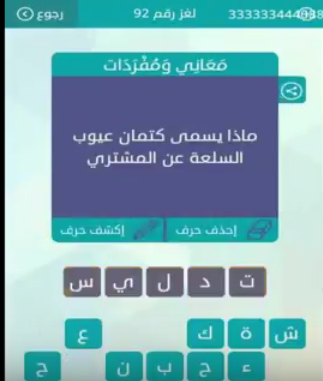 دهشة Daahsha حل لغز ماذا يسمى كتمان عيوب السلعة عن المشترى لغز رقم 92 من لعبة وصلة للمجموعة الحادى عشر