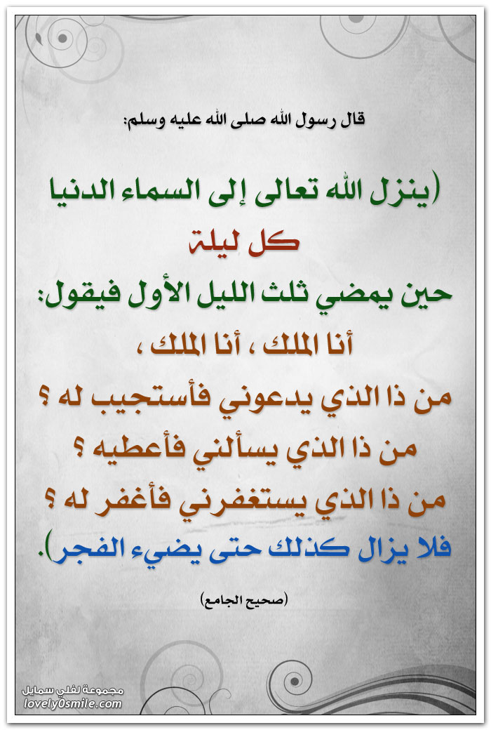 ينزل الله تعالى إلى السماء الدنيا كل ليلة حين يمضي ثلث الليل الأول لفلي سمايل